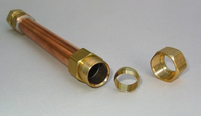 Това е кримпващият пръстен за медни тръби, който гарантира надеждността на свързването на отделните елементи на тръбопровода. По-горе беше описано как да се използва втулка с такъв пръстен на нормалните краища на тръбите.Когато се изисква факелен съединител за медни тръби, се използват и компресионни фитинги.