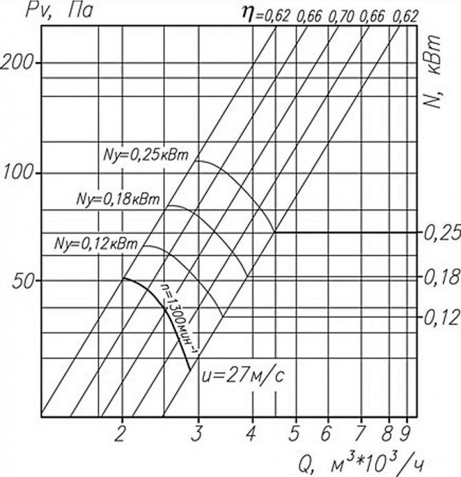 Аеродинамични характеристики на аксиалните вентилатори на графиката: Pv - общо налягане, N - мощност, Q - въздушен поток, ƞ - ефективност, u - скорост, n - честота на въртене