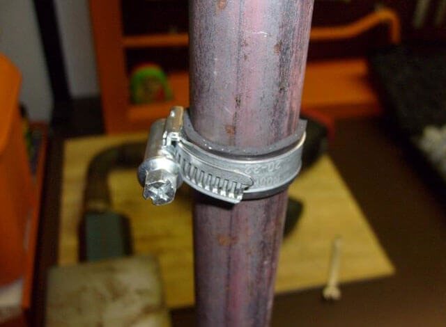 За скобата се изрязва лента от каучуков материал, с няколко милиметра по-широка от самата скоба. Дължината на лентата трябва да бъде с един сантиметър по-къса от обиколката на тръбопровода. Скобата се поставя върху тръбопровода и под нея се поставя гумено уплътнение.