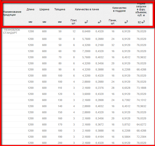 Широчината е - 500мм, 600мм; Дължина на плочата - 1000 mm, 1200 mm; Дебелината варира от 40 до 200 mm (стъпка 10 mm).
