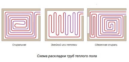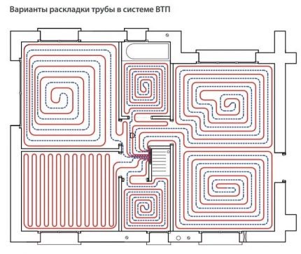 За жилищните помещения се използват три оформления: „змия“, „черупка“ или „охлюв“ и „двойна спирала“. Спираловидният „охлюв“ е най-простият вариант, осигуряващ равномерно разпределение на топлинната енергия. Според тази схема най-често се изграждат подове с водно отопление, тъй като всички ъгли в него са 90º.