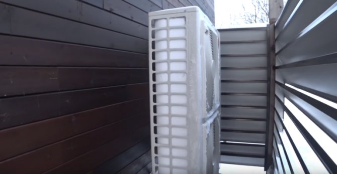 Външното тяло на термопомпата е разположено зад въздухопрозрачните жалузи. Той е достатъчно голям и прилича на индустриален климатик. През зимата тялото на помпата замръзва и е покрито с плътна снежна обвивка. Това е процес, предвиден в неговата работа - според вътрешните си алгоритми оборудването редовно отива на размразяване и напълно се размразява. След това всичко се повтаря.