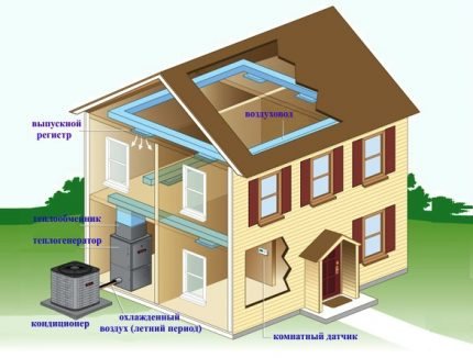 Ако се планира отопление на къща с няколко стаи на различни етажи с термопомпа въздух-въздух, тогава ще е необходимо да се оборудва система от вентилационни канали с принудително впръскване.