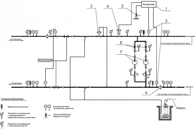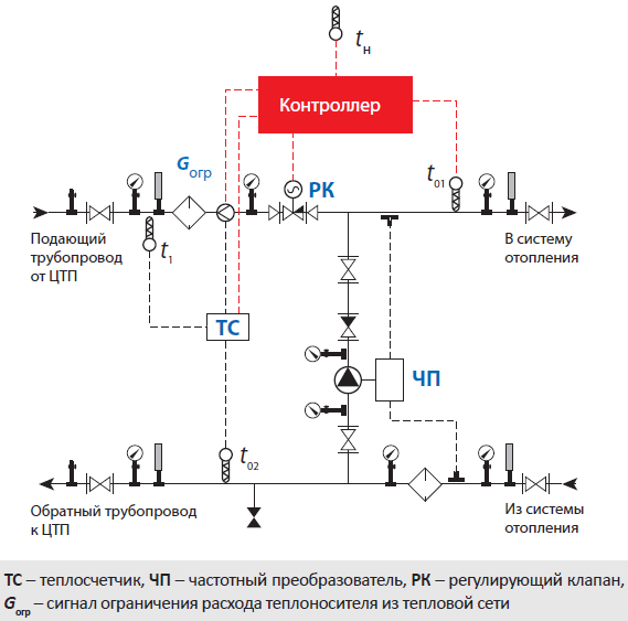 - изпълнение и контрол на поддържането на зададения температурен график на подаващите и връщащите тръбопроводи... Това позволява на системата да бъде защитена от хипотермия и прегряване,