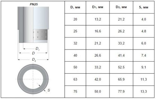 Стандартните външни диаметри на полипропиленовите тръби са 16, 20, 25, 32, 40 мм. Вътрешният диаметър на тръбите с клас РN25, съответстващ на тези стойности, е съответно 10,6, 13,2, 16,6, 21,2, 26,6 mm.