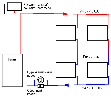 - Създаване на гравитационно налягане. Течността се движи през разликата в плътността при нагряване и охлаждане. Нагретите водни маси се качват нагоре, охладените се спускат надолу. Гравитационното налягане се създава чрез инсталиране на котела в най-ниската точка, наклона на хоризонталния тръбопровод по протежение на движението на водата.