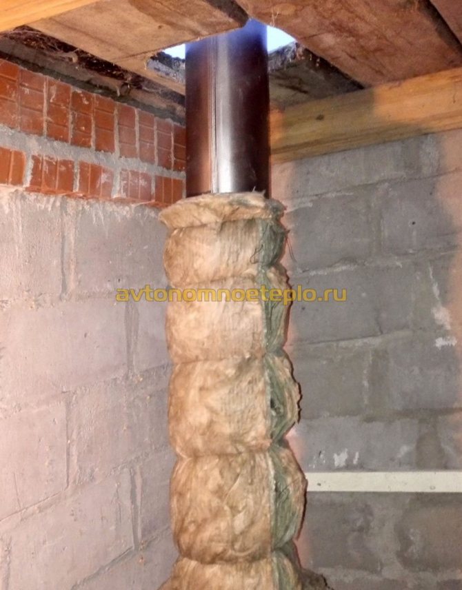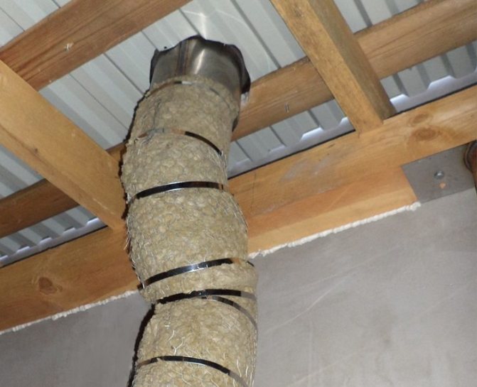 Трябва също да се отбележи, че изолацията изпълнява задачата не само за изолация, но и за топлоизолация. Това е важно в условия, когато тръбата преминава близо до строителни елементи, изработени от горими материали. В този случай температурата на контакт между тръбата и материала трябва да бъде доста под температурата на запалване.Този резултат е напълно постижим, ако използвате изолация за комина, например от базалтова вата.