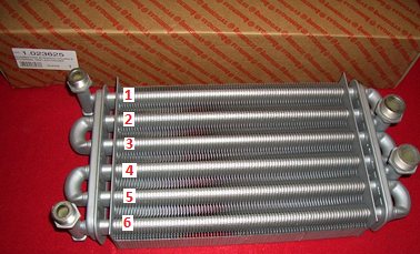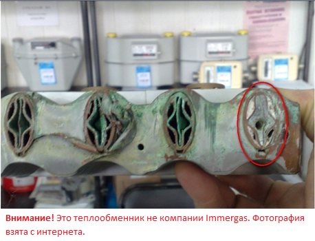 1. Първоначално беше евтин топлообменник и се спестяваше от него. В Immergas топлообменникът се състои от 6 тръби. Това дава предимството, че площта на топлообмен е по-голяма и следователно не е необходимо да се монтира по-близо до пламъка на горелката, за разлика от топлообменниците с 4 и 5 тръби, където площта на топлообмен е много по-малка и е необходима за получаване на мощността на котела и в двата случая - 24 kW. Съответно температурата на пламъка, който загрява стените на топлообменника, е по-ниска.