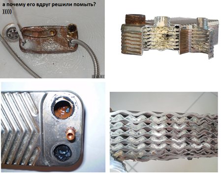 Грешка на абоната: 1. Постоянно захранва отоплителната система и не се обажда на капитана. 2.Не съм правил годишната поддръжка на котела, на която капитанът проверява потока на водата през захранването с топла вода. И също така пита как е работила отоплителната система през зимата. 3. Постоянно повишаване на температурата на отоплението (радиаторите се затоплят по-малко) и топлата вода (постепенно става по-студено). Как беше необходимо да страдате и да не се уважавате? - обадете се на капитана за подмяна и ремонт, само докато проходите са напълно запушени. В тази ситуация топлообменникът трябва само да бъде заменен.
