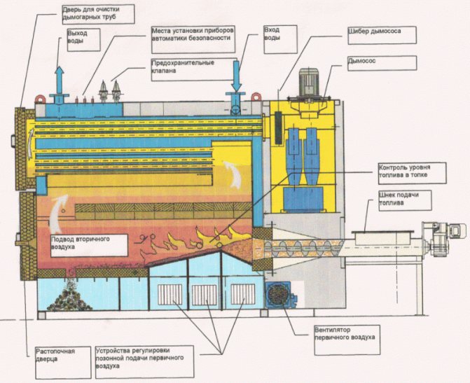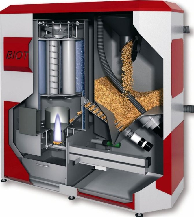 В своя състав такова оборудване има специален затвор. С негова помощ се извършва дозиране на въздух, постъпващ в горивната камера.Когато стърготините тлеят, се генерират димни газове, генериращи голямо количество топлина.