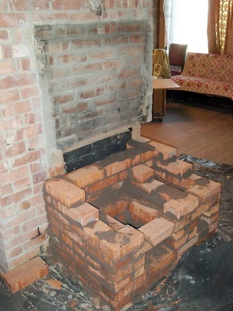Най-скъпата и отнемаща време модификация на печка в камина е пълно разглобяване на съществуващата конструкция и създаване на нова. Печката трябва да бъде напълно демонтирана, ако е необходимо, изсипете нов пясък в основата. След това направете покривна хидроизолационна подова настилка и създайте нова зидария според една от съществуващите схеми.