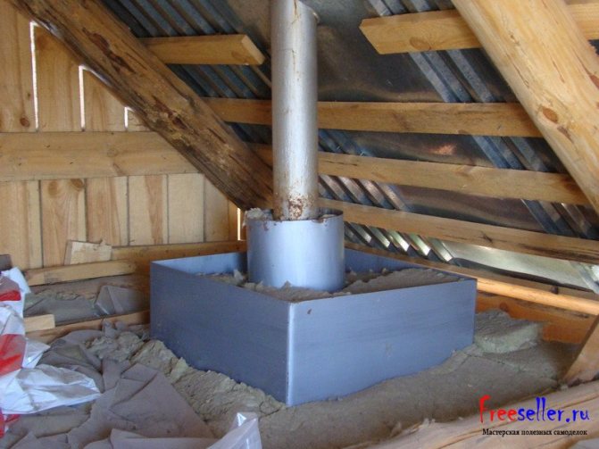 В тавана над преминаващия щранг трябва да се изреже квадратна дупка от 40 см, така че коминът да се намира точно в центъра му. Подобен отвор се прави във външния покрив на банята. След това трябва да се изрежат два квадрата от дебел лист метал с размери 50х50 см. Те трябва да бъдат фиксирани на тавана и на покрива. В ъглите на заготовките трябва да се пробият дупки за последващо закрепване. В центъра на металните квадратчета трябва да се направят дупки, равни на диаметъра на щранга.На заготовката, която ще бъде монтирана на покрива, дупката трябва да бъде направена не кръгла, а овална, защото ще трябва да бъде подгъната до наклона на покрива.