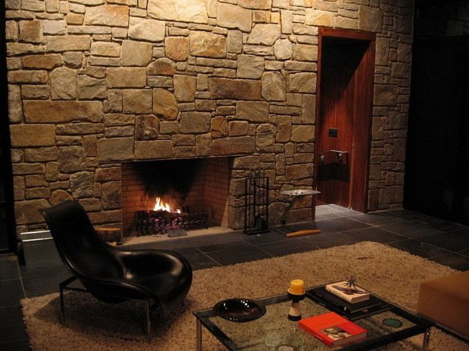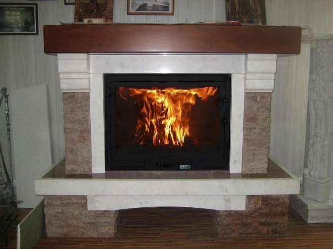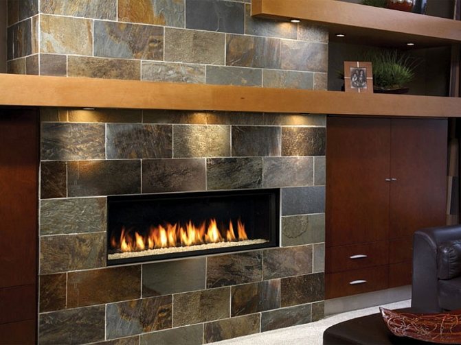 Скъпият вид на скучна камина ще осигури разлика в текстурите. Гладките и груби плочки от един и същи цвят ще се превърнат в фона на предмети на изкуството.
