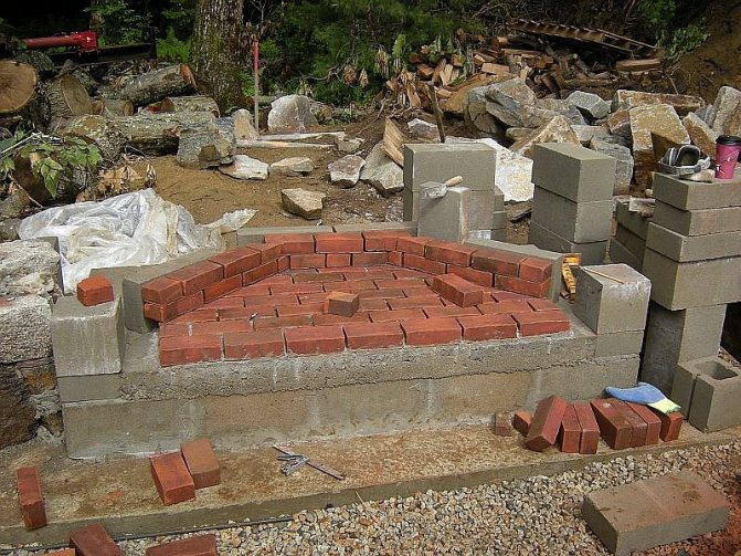 - Изграждаме камина. За свързване на готовите блокове се използва смес от една част пясък и цимент и шест части пясък.