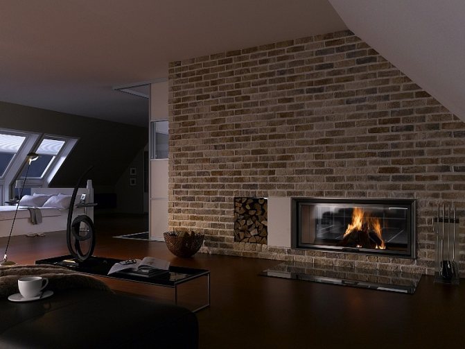 Бетонните камини, сглобени от блокове, са хармонично съчетани с естествено дърво в интериора