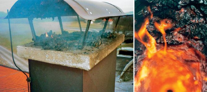 Специален вентилатор, инсталиран вътре в комина, ще осигури необходимата сила на сцепление, а устройството, монтирано под формата на дюза в горната част на комина, също ще играе ролята на дефлектор