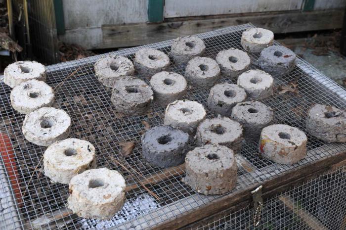 4. Получената смес трябва да се излее във форма и да се сплеска с преса. Уверете се, че от кашата излиза възможно най-много вода. След това получените продукти трябва да бъдат добре изсушени на слънце. За да бъдат трайни, всеки елемент трябва да бъде покрит с хартия или парцали. След като изсъхнат напълно, всички брикети могат да се сгънат заедно.