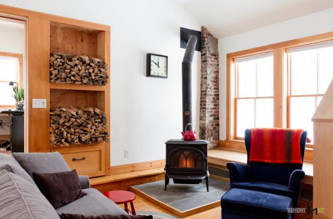 Картината показва отоплителна камина със зидария на дърва за нея.