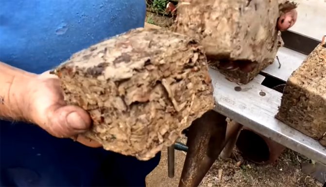 Крикът е проектиран по такъв начин, че да неутрализира човешките усилия. Идва обаче момент, когато дори той не е в състояние да прокара платформите по-нататък. След това трябва да изчакате няколко минути, докато останалата течност изтече и можете да получите почти готови брикети. Защо почти? Да, те просто трябва да изсъхнат старателно. Докато са сурови, те могат да бъдат счупени, като ги пуснете от височината си. Но когато брикетите изсъхнат, става трудно да ги чупите дори с чук.
