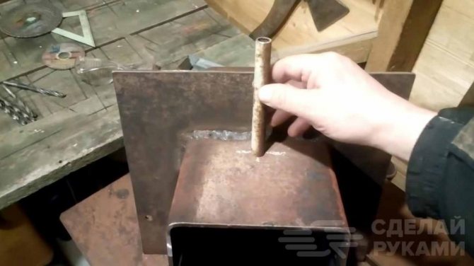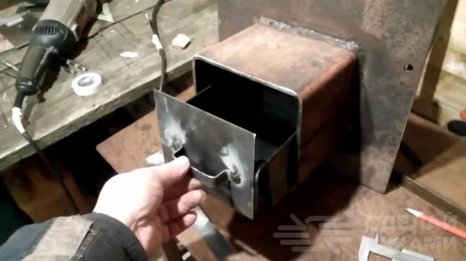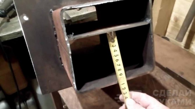 За вътрешната преграда на горивната камера трябва да изрежете детайл от метал с дебелина 5 мм (размери 16,5 * 20 мм). Преградата ще трябва да бъде заварена към стените на квадратната тръба отвътре.