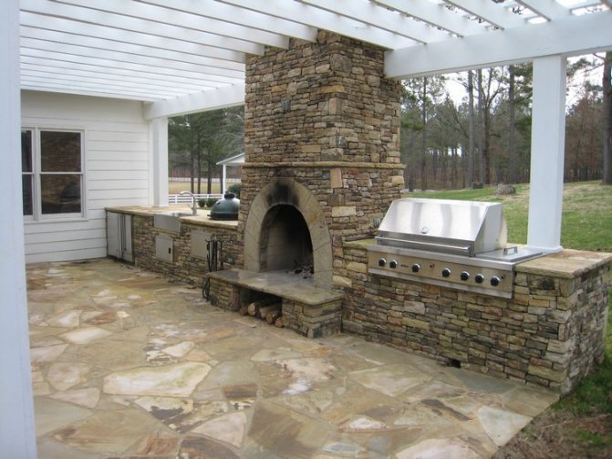 - Вградено барбекю. За нас мангалът е свързан с барбекю или начина на готвене, въпреки че сред много народи от Близкия изток той се счита за универсален инструмент за готвене. Камината на такава камина е направена под формата на купа с вертикални стени. След изгаряне на дървата, останалите въглища се използват за пържене, печене и дори пушене на храна. Камина с барбекю в страната винаги е в търсенето при провеждане на семейни празници.