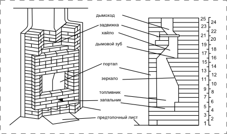 За да изградите правилно печка или камина, е необходимо всеки ред да бъде разположен точно според схемата. Но първо, покривният материал се полага върху повърхността на основата на два слоя, което ще осигури необходимото ниво на хидроизолация. Това е последвано от полагането на солиден слой тухла. Много е важно да се поддържа хоризонталното ниво на основата.