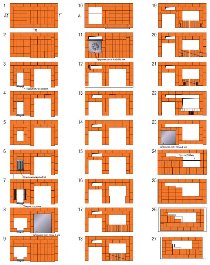 Някъде от 6-ия ред започва образуването на опорна основа, това става чрез напречно полагане на тухли. Половин тухла представлява зидария; върху тях можете да инсталирате рафт за пържене, ако това е предвидено в проекта.