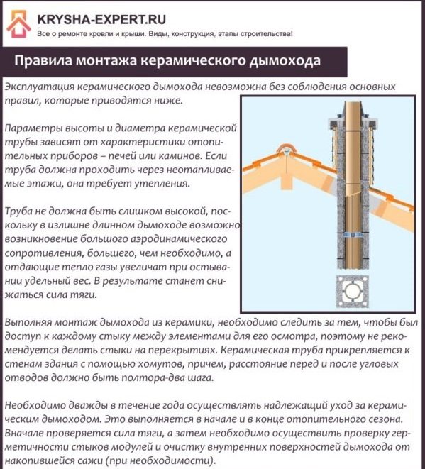 Тръбата на керамичния комин е направена от отделни блокове, които се прилепват добре един към друг, поради което не се появяват течове от дим. Височината му се изчислява предварително, в съответствие с действащите разпоредби. Прекомерната дължина на комина няма да подобри тягата, а само ще създаде сложни аеродинамични вихри, които не допринасят за ефективната работа на системата за изпускане на газ. Тръбата се набира, като се ръководи от правилата: