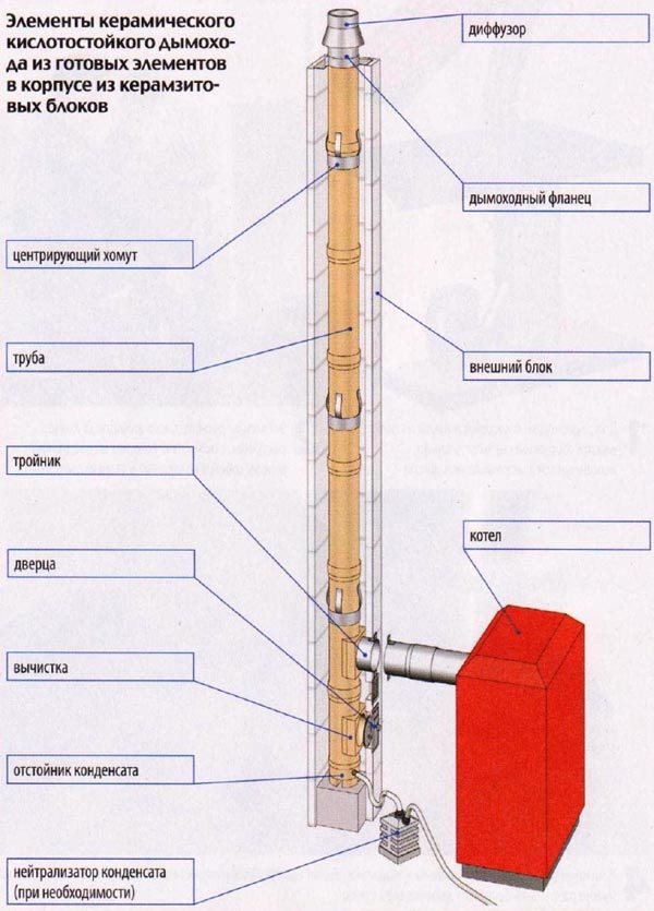 Такъв сериозен дизайн се дължи на редица фактори. Първо, керамичната тръба, която образува комина, е много крехка и се нуждае от опора. На второ място, той има висока топлопроводимост, поради което изисква надеждна топлоизолация.