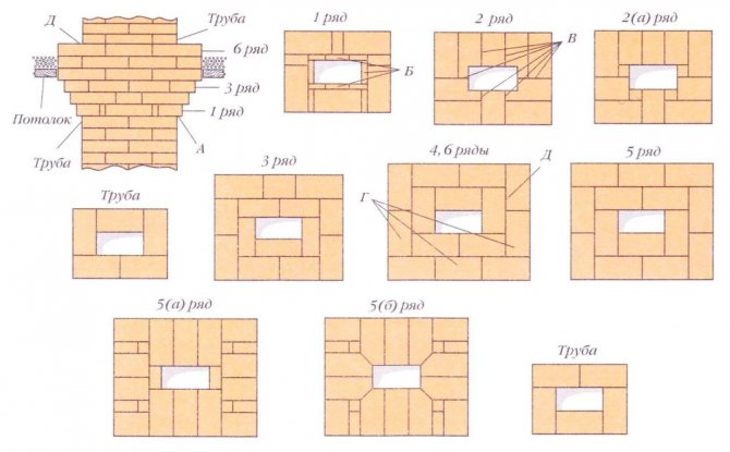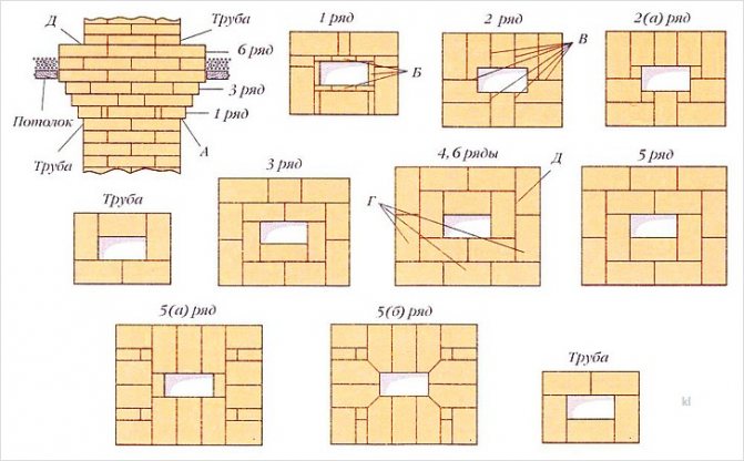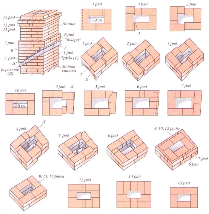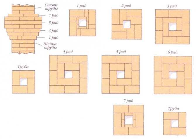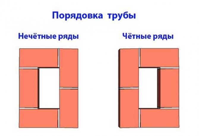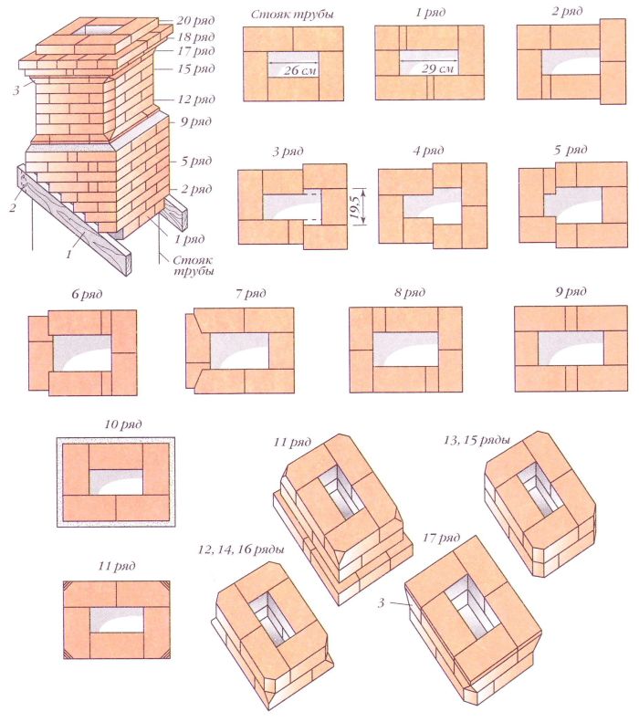 Тъй като тухлите са с различни размери, тогава, преди полагане на главата на тръбата, 14-ият ред се полага сух на пода, така че зидарията на реда да бъде разделена на половинки от тухлата. Шевът между тухлите е 5 мм. Ако поставим последния 15-ти ред от пет тухли на този ред вертикално към тръбния щранг, тогава около него ще се получи издатина от 6 см. Необходимо е да се разделят тези 6 см на два реда, получаваме, че във всеки ред е необходимо да се правят празнини от 3 см. В горния допустим ред зидарията е разделена на цели тухли и половини, което го прави по-опростен.