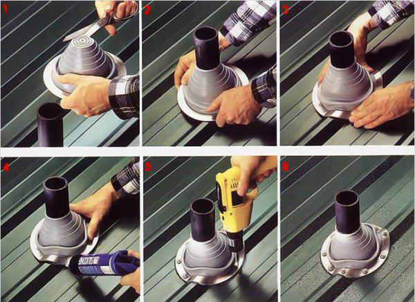 В допълнение към еластичните проходи има и метални проходи, които се използват за извеждане на кръгли тръби за комина. Такива проходи имат предварително определен ъгъл на наклон и се монтират само върху подовата настилка, която няма ребра, тъй като те трябва да прилепнат плътно към нея. Такова проникване е монтирано по малко по-различен начин. В покрива е направен отвор за тръбата. Ако е необходимо, част от решетката се изрязва. Най-лесният начин да направите това е с бутален трион или мозайката.
