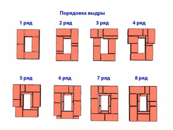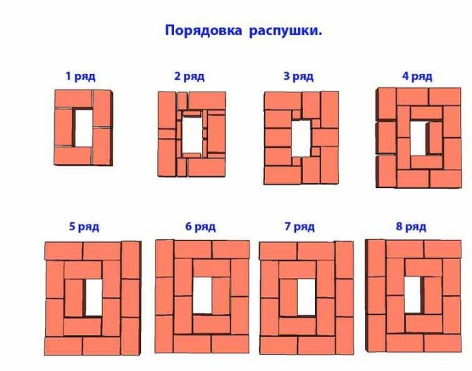 - Вътрешната повърхност (за пушене) на първия ред е разположена на 1/8 парчета. Пропуските между външните тухли се запълват с 1/4 парчета.