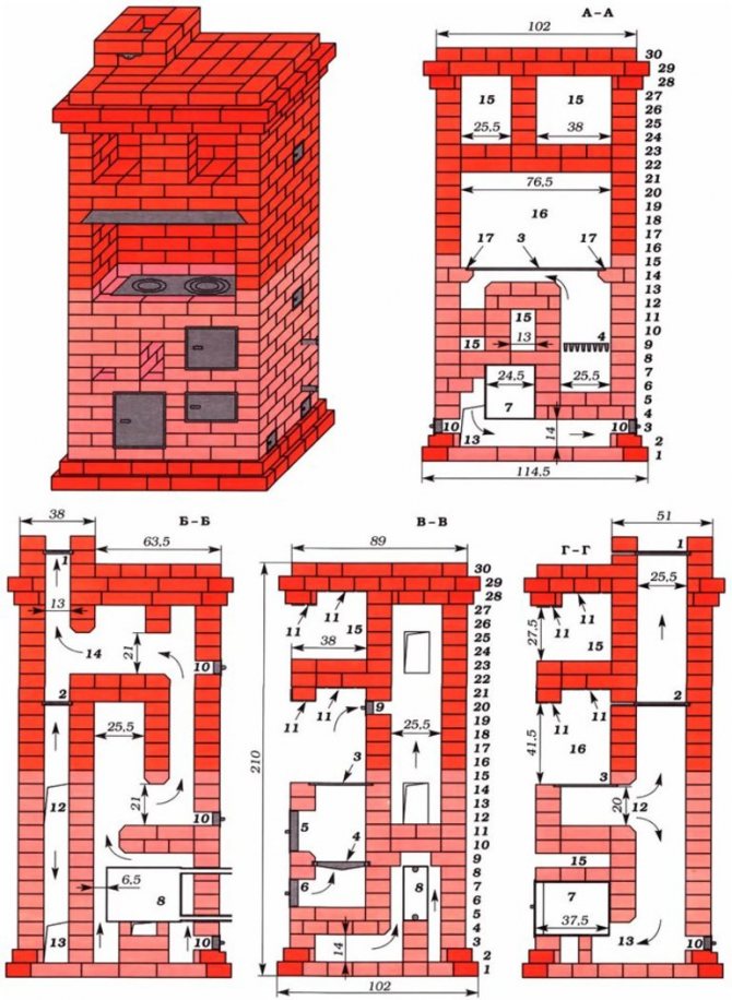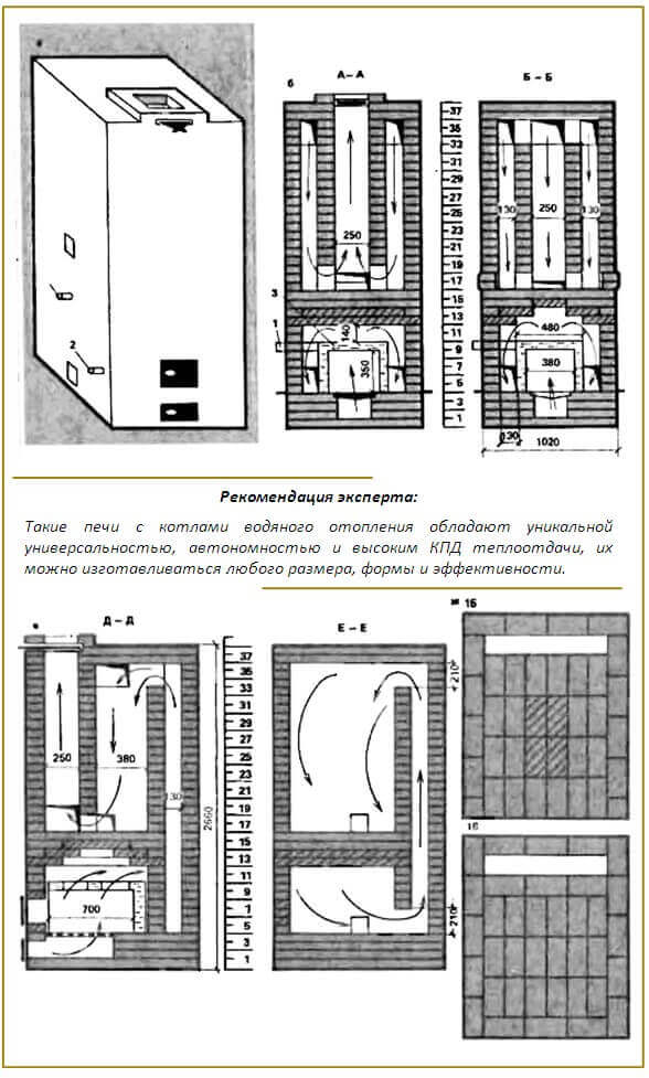 Такава пещ се поставя от огнеупорни тухли, като се използват същите огнеупорни хоросани.Врати: пещ, вентилатор, почистване, камера за готвене. Чугунена печка с котлон, кутия за топла вода, фурна, решетка за сушене, решетка. Печките на дърва с котел за отопление с гореща вода върху тухлена зидария имат подобен дизайн.