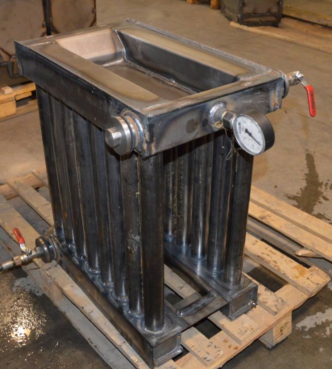 Котел, който е отличен по своите качества и ефективност, може да бъде получен от обикновени чугунени отоплителни радиатори. Като основа можете да вземете радиатора M-140. Лесно е да се намери, тъй като в големи количества те се изнасят за скрап по време на демонтажа и разрушаването на повечето от старите пететажни сгради. Капацитетът на всяка секция на такива радиатори е 1,5 литра вода, докато повърхността достига 0,254 квадратни метра. Сглобени, когато се комбинират 12 такива секции, обемът на течността е 18 литра, а общата повърхност е 3 квадратни метра. м. Не всеки готов котел, сглобен от ламарина, може да се похвали с такива параметри с подобни размери. Ефективността на такъв котел от радиатор може да бъде напълно достатъчна за отопление на помещение с площ до 100 кв. м. Така че е подходящ за обикновена баня, а запасът също ще бъде достатъчно голям.
