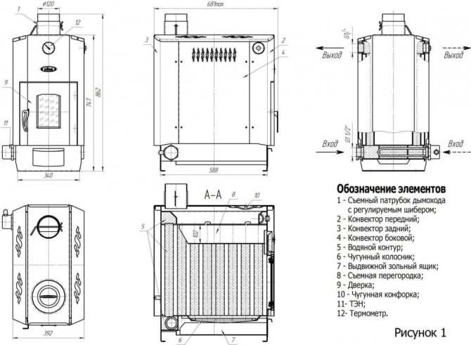 Тухлените фурни от този тип не включват особено сложна зидария. Печка с бойлер за отопление на водата има доста опростен дизайн: чугунена готварска плоча, готварска камера, изпускателен канал, кутия за гореща вода, фурна.