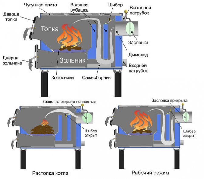 Такъв домашно приготвен котел не трябва да се поставя в камината, където гори дървото, а в коминните камери, които са разположени непосредствено зад камерата на пещта. Тъй като се използват чугунени радиатори, те трябва да се нагряват не с пламък, а с горещи газове, които се отделят от горивната камера.