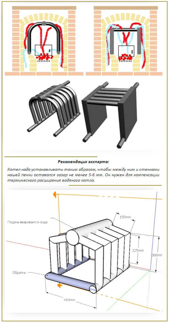 Входящата тръба е най-добре разположена в горната част на конструкцията, а връщащата тръба е разположена на всяко удобно място. Тръбите не са заварени челно, а с скосявания, за да се избегнат неварени участъци, които ще текат в бъдеще. Минималното разстояние между коленете на конструкцията е 5-6 см, така че нагряването на всяко коляно е максимално. Преди да поставите такъв котел директно в пещта, е необходимо да го напълните с вода и да проверите за течове, които незабавно се елиминират.