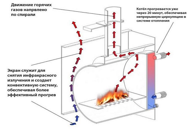 За разлика от тях хоризонталният многозавивен комин се загрява много по-ефективно.Тъй като горещите газове се стремят нагоре, а горната площ на хоризонталния комин е много по-голяма от тази на вертикалния, следователно отоплението се извършва много по-добре, използвайки същия обем гориво.