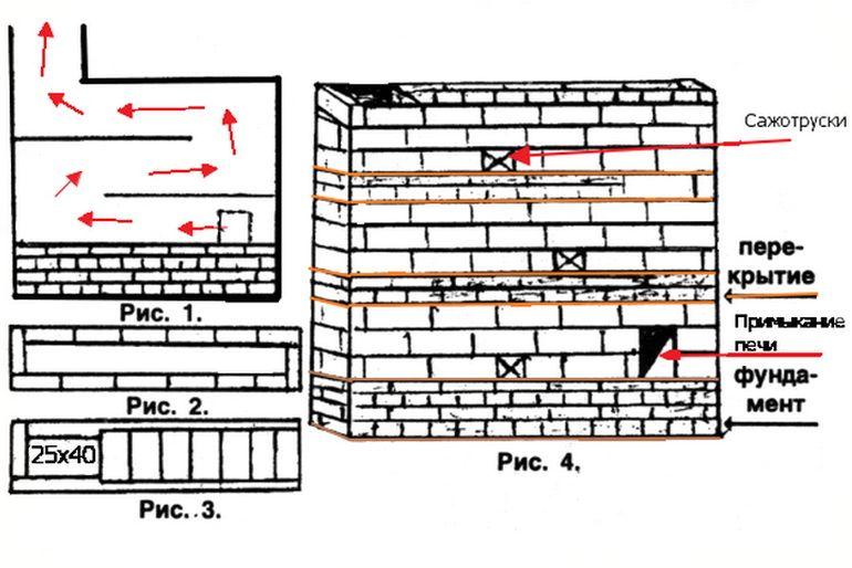 - За целта полагаме два реда тухли по такъв начин, че да получим хоризонтален канал на комина. Фигурата показва как да направите това. Тухлите се полагат по обичайния начин за тухлена зидария.