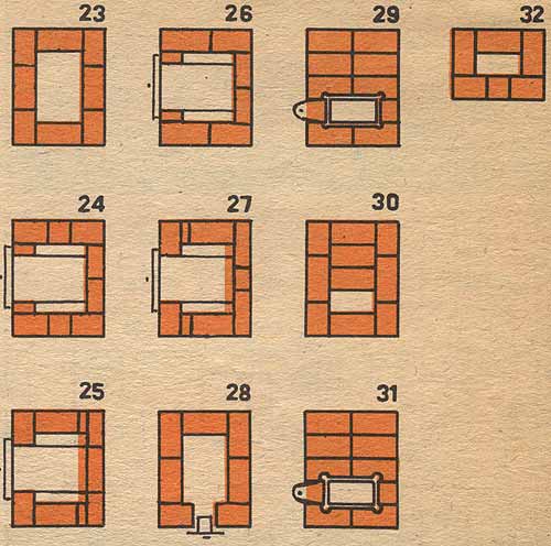 1 ред - изцяло облицована с тухли. 2-ри и 3-ти ред се полагат следвайки реда. На нивото на 4-ти ред се поставят 2 почиствания и се оставя прозорец сред тухлата за по-нататъшна връзка с щита. На 5-ти ред се извършва същата работа, но се обръща внимание и на обличането на шевовете на пещта. Положен е 6-ти ред, като не забравяме да оставим 2 канала.