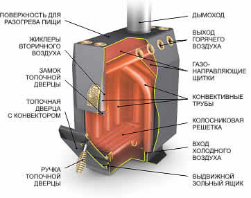 А наличието на газови предпазители позволява най-ефективното използване на газопламенния поток; - Поради разположението на кожуха-конвектор на вратата на пещта, вратата е пълноправен „участник” в процеса на топлообмен;