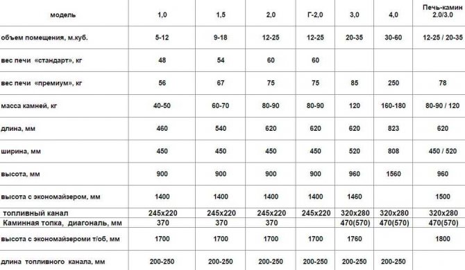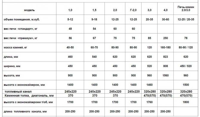 Обемът на парната баня се изчислява чрез числата след името: 1.0 - за 10 кубчета, 2.0 - за двадесет и т.н. В противен случай се съсредоточете върху размера на модулите и как те се вписват във вашите помещения. Техническите параметри и размери на печките Куткин са представени в таблицата.
