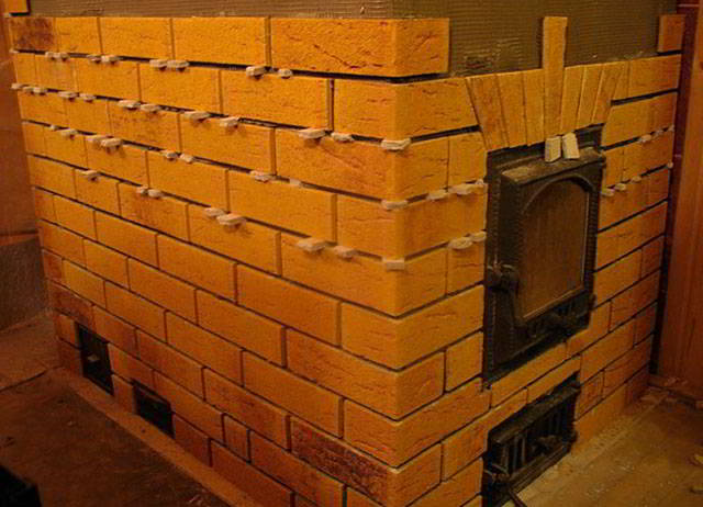За да се наложи тухла върху желязната печка във ваната, на хората, които нямат уменията на зидар, се препоръчва да прибегнат до полагане в "половин тухла" (плоска).