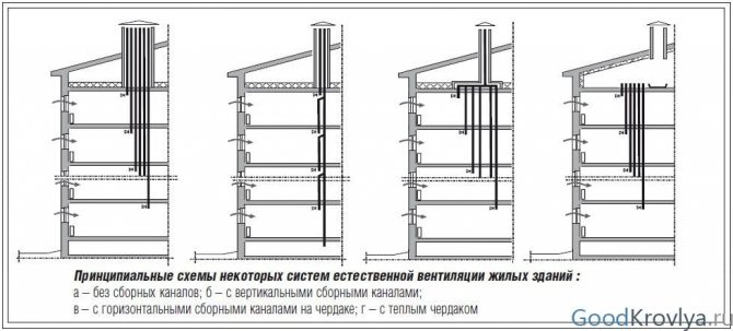 Най-често срещаният естествен, захранващ и изпускателен тип вентилация и комини. В същото време чрез сателитни канали въздухът или продуктите от горенето от помещенията навлизат в общия канал (или колектор на тавана) и след това в атмосферата. Всмукването на въздух се осъществява чрез естествени пропуски и течове в прозорците и вратите.