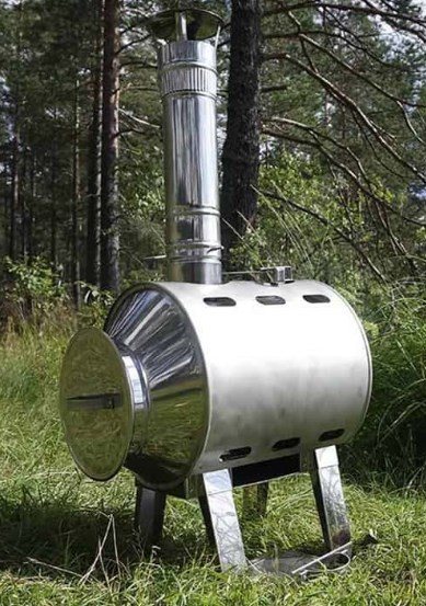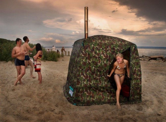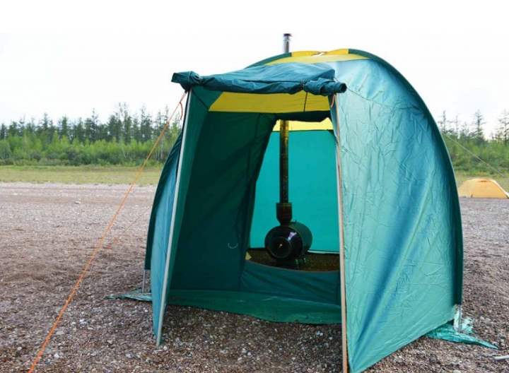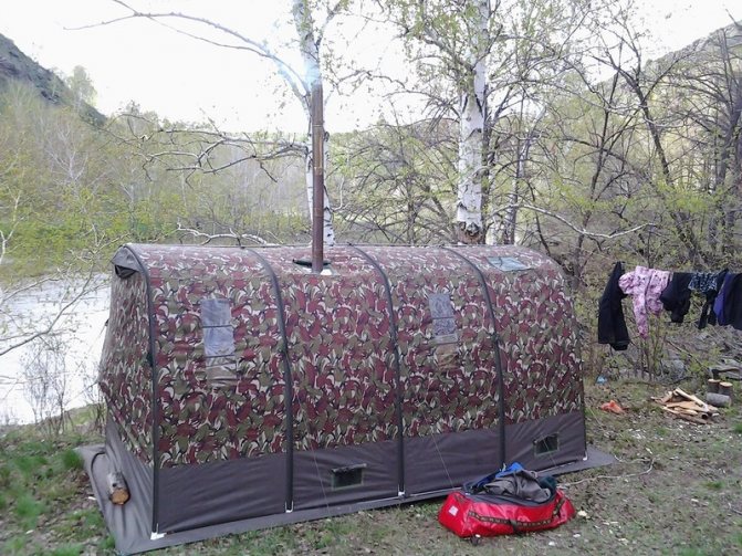 Специални палатки се продават за самоделна метална печка с комин. Тук си струва да се погрижите за безопасността на хората в банята, тъй като къмпинг парна баня, дори в природата, предвижда работа с огън. Ето защо, когато топите печката, е важно да не прекалявате с горивото, така че огнени езици на пламъка да не изскачат от нея.