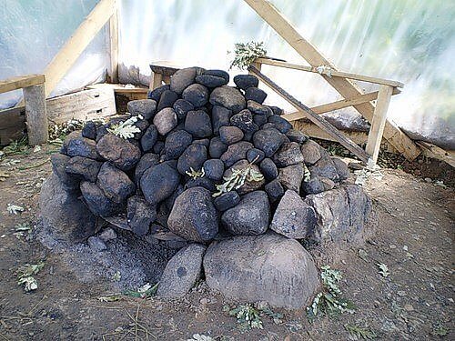 Докато дървото изгаря, постепенно добавяте редици камъни и ги покривате със сухо дърво. Това продължава, докато всички камъни са в огъня. След това те трябва да бъдат доведени до желаната температура, отнема средно 2 - 3 часа, така че огънят трябва да гори през цялото това време.