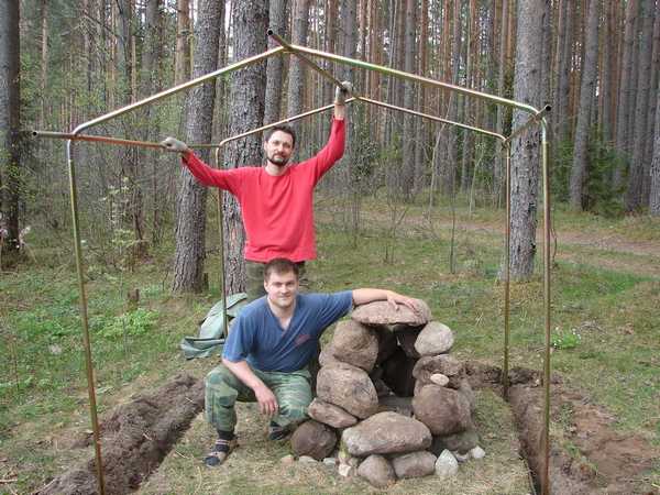 Започваме с нагряване на камъните и докато те се загряват, изграждаме парна баня. Въпреки че ако има достатъчно хора, тогава можете да правите всичко едновременно. В този случай разстоянието от огъня до парната е приблизително 1,5 - 2 м, така че топлината или искрите да не изгорят сенника.