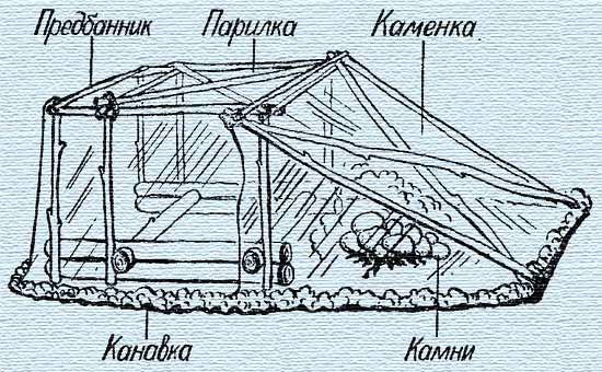 Една от опциите за къмпинг структура, която туристите или рибарите използват, за да припарят сред природата, задължително включва рамка, изработена от здрави и дебели пръчки. Тя трябва да бъде покрита с фолио или брезент. Вътре в конструкцията е оборудвана печка, която ще служи като отоплително средство.Размерът му трябва да е по-малък от самия отдел за пара. Самата парна баня може да бъде разделена на парна баня и съблекалня. За по-добра топлоизолация и създаване на комфортни условия вътре в конструкцията, трупите се полагат по стените.