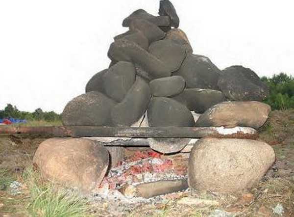 Процесът протича на етапи, първият ред от най-дебелите трупи се полага на земята. Върху него се изсипва един слой камъни. Поставете отгоре ред трупи и ги покрийте с множество камъни. По този начин трябва да получите „сандвич“ от 3 - 4 слоя камъни, след което огънят се запалва.