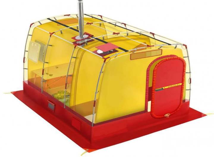 Банята, направена по този проект, може да побере 8 души - и все още ще има много място поради надуването на банята с горещ въздух. И такава баня може дори безопасно да се използва като бързоразгъваем навес за дъжд, което не може да се направи с опцията за съхранение.